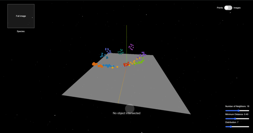 The frontend interface of this project enables various user interactions. People can drag and scroll to navigate through the 3D space, to observe the distribution as well as the relationship between data points. They can click on any data point to reveal more information (such as the name and label). What's more, they will be able to modify the UMAP parameters for calculating the projection and re-locate the data points.
