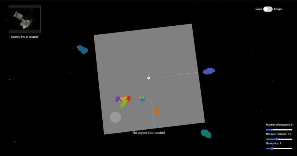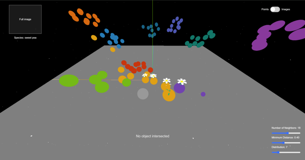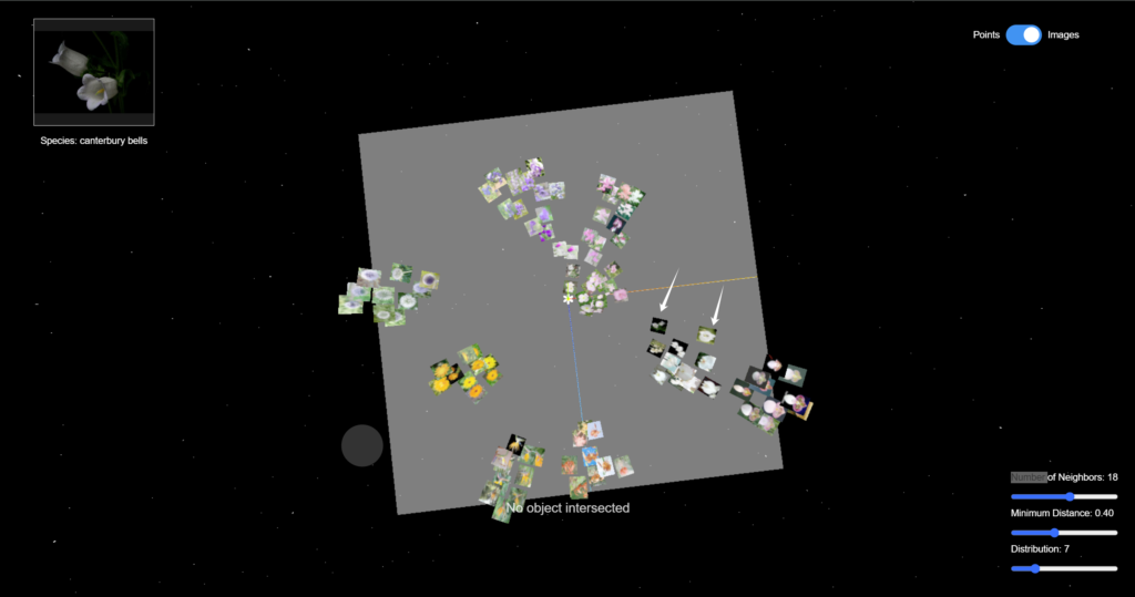 Through using CLIP (Contrastive Language–Image Pre-training) to encode semantic image features and UMAP (Uniform Manifold Approximation and Projection) to reduce high-dimensional data , we unveil the hidden connections within flower images and visualize them in a 3D space with three.js. Explore the space, interact with the data points, and play with the parameters to understand how machine learning classifies sees the data and performs classification tasks.